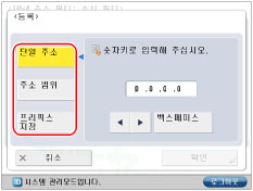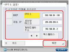 DHCP 또는 자동 IP로 IP 주소를 가져올 수 없을 경우, [IP주소], [서브넷 마스크]와 [게이트웨이 주소]를 입력합니다.