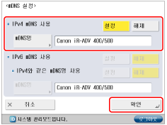 mDNS 이름을 변경하지 않는다면 "Canon <제품 명>"이 자동으로 설정됩니다. 같은 mDNS 이름이 네트워크에 이미 존재할 경우 이름이 "Canon <제품 명>******("******"은 MAC 주소의 끝에서 부터 6자리를 나타냅니다.)"이 됩니다.
