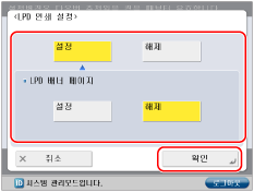 IPP 인증 기능을 사용하려면 <인증사용>에서 [설정]을 누릅니다. [사용자명]을 누르고 → IPP 인증에 사용할 사용자 이름을 입력한 후 → [확인]을 누릅니다. [비밀번호]를 누르고 → IPP 인증에 사용할 비밀번호를 입력한 후 → [확인]을 누릅니다. 확인입력 화면에서 동일한 비밀번호를 입력하여 비밀번호를 확인하고 → [확인]을 누릅니다.