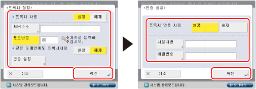 프록시 인증을 사용하려는 경우 [인증 설정] → <프록시 인증 사용>에서 [설정]을 누릅니다. [사용자명]을 누르고 → 프록시 인증에 사용할 사용자명을 입력한 후 → [확인]을 누릅니다. [비밀번호]를 누르고 → 프록시 인증에 사용할 비밀번호를 입력한 후 → [확인]을 누릅니다. 확인입력 화면에서 동일한 비밀번호를 입력하여 비밀번호를 확인하고 → [확인]을 누릅니다.