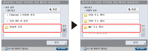 [네트워크]에서 [방화벽 설정] → [MAC 주소 필터]를 누릅니다.