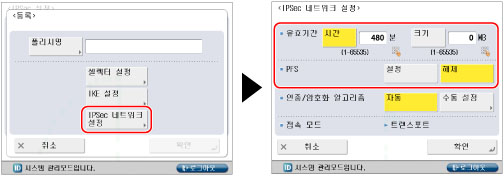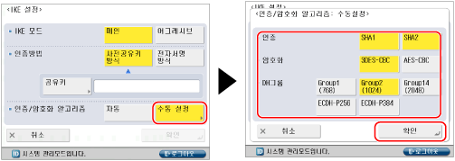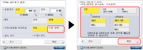 FIPS 140-2 준수하는 IPSec 통신을 설정한 경우 인증 방법으로 [ESP (AES-GCM)]를 설정한 정책은 사용 불가합니다. 동시에 이 폴리시에 대한 인증 알고리즘이 SHA1로 자동 변경되고 이 폴리시에 대한 암호화 알고리즘이 3DES-CBC로 자동 변경됩니다. (See "FIPS 140-2를 준수하는 암호화 방법 사용.")