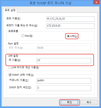 [프로토콜]에서 [LPR]을 선택하고 → <LPR 설정>의 [큐 이름]에서 인쇄 대기열 이름을 입력한 후 → [확인]을 클릭합니다.