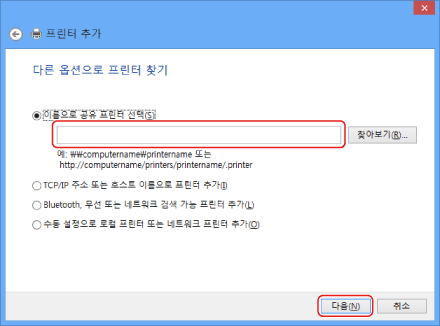 Windows 8/Server 2012: [원하는 프린터가 목록에 없습니다] → [이름으로 공유 프린터 선택]을 선택합니다.