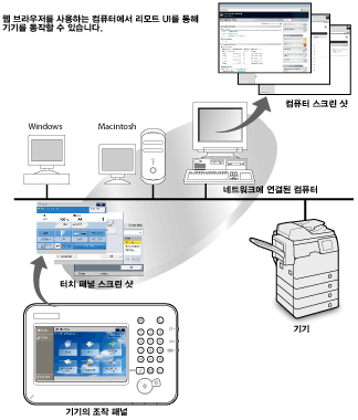 리모트 UI를 사용하면 작업을 일시 정지 및 재개하고 시스템 박스에 있는 작업과 관련된 작업을 수행할 수 있으며 다양한 설정을 지정할 수 있습니다. 리모트 UI를 사용하면 기기의 조작패널 대신에 컴퓨터에서 기기를 설정 및 조작할 수 있습니다.