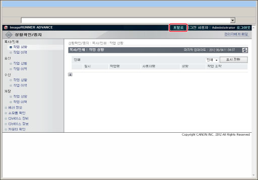 리모트 UI를 사용하여 네트워크를 통해 기기에 액세스하여 기기의 현재 상황과 설정, 모든 정보 및 작업 처리 상황을 표시할 수 있습니다. 기기 자체에서 조작을 수행하지 않고도 네트워크에 연결된 컴퓨터에서 기기를 관리할 수 있습니다. 기기의 IP 주소를 웹 브라우저에 입력하면 아래 표시된 대로 리모트 UI 의 첫 페이지 또는 메인 화면이 컴퓨터 화면에 표시됩니다.