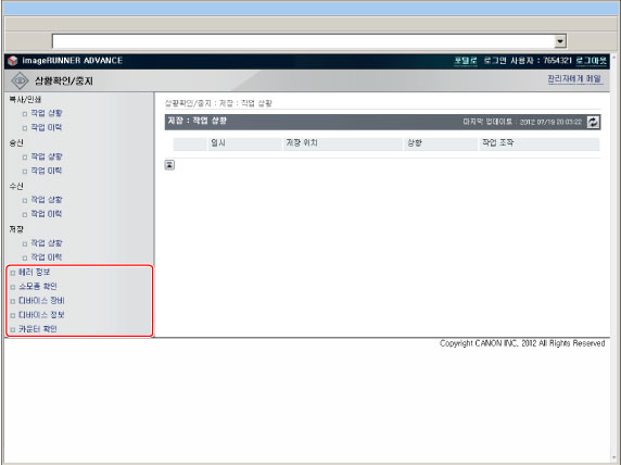 리모트 UI(사용자 인터페이스)를 사용하여 여러 급지 위치에 남아 있는 용지량 등 기기의 현재 상황을 확인하고 에러를 확인할 수 있습니다. 또한, 기기의 시스템 관리자에 대한 정보, 기기를 설치한 장소 및 기기의 프로토콜 설정에 대한 정보도 얻을 수 있습니다.