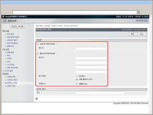 또는 리모트 UI의 포탈 페이지에 표시될 메시지를 입력합니다. 한 줄당 23개 문자까지 입력할 수 있고 4줄까지 메시지를 입력할 수 있습니다.