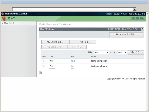 주소 리스트 관리 작업은 기기의 조작 패널에서