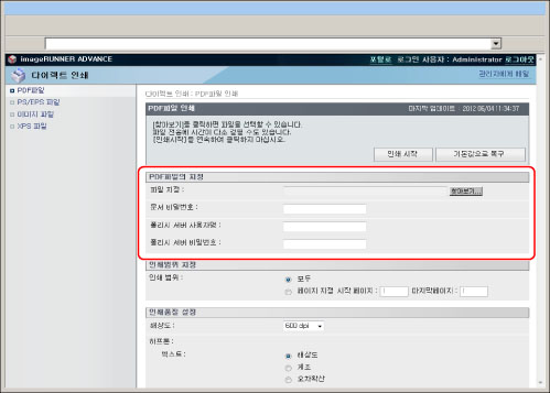 비밀 번호 입력 없이 파일을 인쇄하려 할 경우 <PDL PDF Data Decode Err> 메시지가 표시되고 인쇄가 취소됩니다. 인쇄가 금지된 PDF 파일을 인쇄하거나 저해상도 인쇄만 허용된 PDF 파일을 고해상도로 인쇄하려는 경우에는 마스터 비밀번호를 입력하십시오.