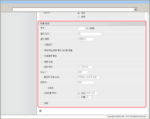 이 설정을 사용하면 인쇄 부수를 지정할 수 있습니다.