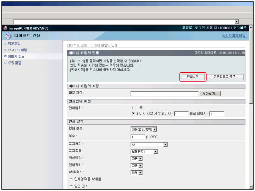 파일이 전송될 때 [인쇄시작]을 반복해서 클릭하지 마십시오. 파일을 전송하는 데 약간의 시간이 소요됩니다. 그러나, 전송 중 반복해서 클릭할 경우 파일이 손상되거나 전송이 되지 않을 수 있습니다.