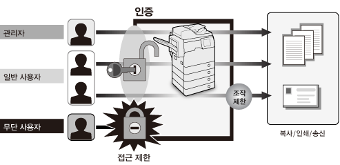 관리자는 인증 모드를 사용하여 일반 사용자의 액세스를 제한하고 작업에 대한 제한을 설정함으로써 사용자를 관리합니다. 일반 사용자 권한은 사용자별로 설정할 수 있습니다. 관리자는 무단 사용자의 액세스를 방지함으로써 기기 변경 및 정보 누출 위험을 줄일 수 있습니다.