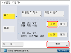 등록된 부문 ID에 해당되지 않은 프린터 드라이버의 인쇄 작업 및 등록된 부분 ID에 해당되지 않는 컴퓨터의 네트워크 스캔 작업을 허용하도록 지정할 수 있습니다.