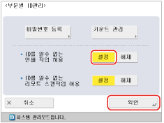<ID를 알수 없는 인쇄 작업 허용> 및 <ID를 알수 없는 리모트 스캔작업 허용> 설정은 기기에 인쇄 기능 및 리모트 스캔 기능이 장착된 경우에만 사용가능합니다.