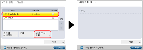 <사용상황>에 '사용중...'이 표시되는 키 페어는 IEEE802.1X 인증/IPSec에서 사용되고 있거나 SSL이 '설정'으로 지정되어 있으므로 삭제할 수 없습니다. [사용 위치 표시]를 눌러 키 페어가 현재 사용 중인 보안 종류를 확인합니다. SSL에만 사용 중인 키 페어를 삭제하려면 다음 설정을 '해제'로 설정합니다. IEEE802.1X 인증/IPSec에 사용 중인 키 페어는 삭제할 수 없습니다.