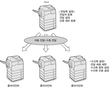 <수신측 설정>에 대해 [전달원에 의한 수신제한]을 '해제'로 설정한 경우 다른 기기 모델에서 전달된 기기 정보를 수신할 수 있습니다. (See "수신 기기 설정.") 단, 일부 정보가 올바르게 전달되지 않을 수도 있습니다.