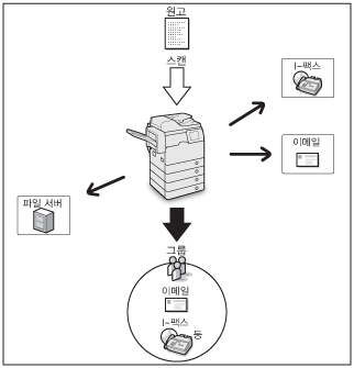 스캔한 문서를 이메일 주소, I-팩스 주소 또는 파일 서버로 송신하려면 네트워크 설정을 지정해야 합니다. (See "이메일/I-팩스 공통 통신 설정.")