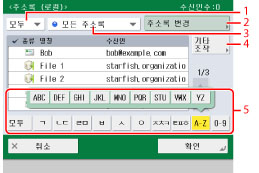 영숫자 키(예: [ABC])를 눌러 각 문자 또는 숫자에 대한 개별 키를 표시합니다. 문자 또는 숫자를 선택하여 표시된 입력 항목의 범위를 제한할 수 있습니다. [모두]를 눌러 전체 주소 리스트로 돌아갑니다.