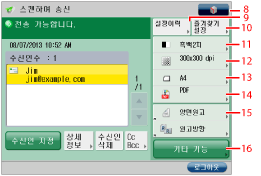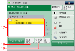 팩스 수신인을 표시하려면 [팩스기능 표시]에서 <<스캔하여 송신>에 팩스 표시>를 '설정'으로 지정합니다. (See "팩스 기능 표시.")