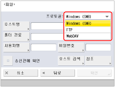 imagePASS가 장착된 다른 imageRUNNER ADVANCE 기기의 고급 박스에 파일을 저장하려면 [WebDAV]를 선택합니다. (Windows (SMB)는 사용할 수 없습니다.)