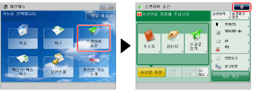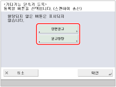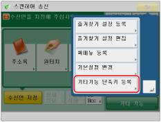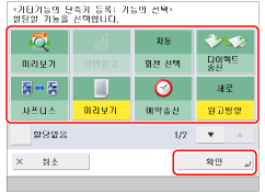 두 가지 기타 기능 단축키가 스캔하여 송신 화면에 표시됩니다. [양면원고] 및 [원고방향]은 기본으로 표시됩니다. 이러한 단축키를 자주 사용하는 기능으로 변경할 수 있습니다.