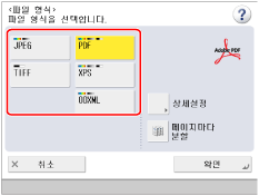 PDF, XPS 또는 OOXML 형식으로 송신하는 경우 추가 설정을 선택할 수 있습니다. 각각의 PDF, XPS 또는 OOXML 형식 설정에 대한 자세한 내용은 다음을 참고하십시오.