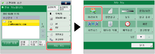 수신인을 지정하고 → [기타 기능]을 누른 다음 → [미리보기]를 누릅니다.