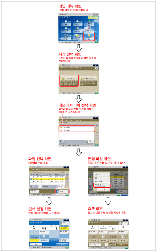[파일 추가 (스캔하여 저장)]와 관련된 절차 및 스캔 화면에서 조작에 대한 사항은 "파일 추가(스캔하여 저장)" 및 "스캔하여 저장 조작 순서."를 참고하십시오.