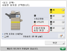 <수동급지대 용지변경: 용지 종류>에서 상세 설정 리스트에 표시되지 않는 용지 종류를 등록할 수 있습니다. 용지 종류 저장에 대한 자세한 내용은 "사용자 설정 용지 종류 등록/편집."을 참고하십시오