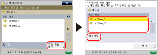 [저장 정보 확인]을 누르고 → 원하는 저장 위치를 선택하고 → [상세정보]를 누릅니다.