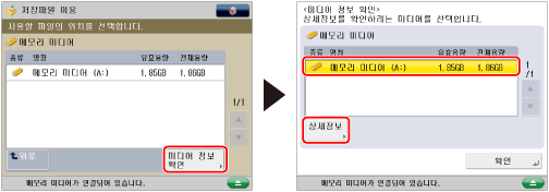 [미디어 정보 확인] → 원하는 메모리 미디어를 선택하고 → [상세정보]를 누릅니다.