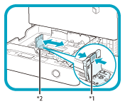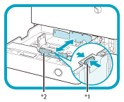 측면 가이드에 있는 레버를 누릅니다. 레버를 누른 상태에서 측면 가이드를 왼쪽 또는 오른쪽으로 슬라이드하여 원하는 용지 크기 표시에 맞추십시오.