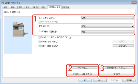 기기에 장착된 프린터 옵션(용지 급지 방법, 용지 출력 옵션 등)을 설정할 수 있습니다.