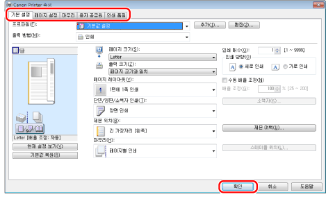 [기본 설정] 탭에서 [단면/양면/소책자 인쇄]의 기본 설정은 [양면 인쇄]입니다. 자세한 내용은 "단면 인쇄 및 양면 인쇄"를 참고하십시오.