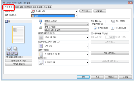[기본 설정] 탭의 [단면/양면/소책자 인쇄]에서 [단면 인쇄]를 선택한 경우. 자세한 내용은 "단면 인쇄 및 양면 인쇄"를 참고하십시오.