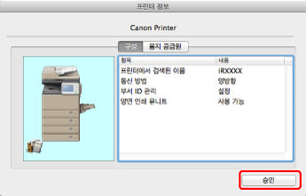 [프린터 정보] 대화상자 맨 위에 표시된 프린터 드라이버 이름과 [프린터에서 검색된 이름]으로 표시된 프린터 이름이 서로 일치하지 않으면 프린터 기능을 제대로 사용하지 못할 수도 있습니다. 이름이 일치하지 않을 경우 [시스템 환경설정]에 추가한 프린터를 삭제했다가 다시 추가하십시오. 자세한 내용은 "프린터 드라이버 설명서"를 참고하십시오(" 설치" 참고).