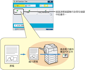 例如,只需按一個按鈕即可執行縮小原稿,將已掃描資料轉換為PDF檔案,然後使用電子郵件傳送該PDF的所有操作。