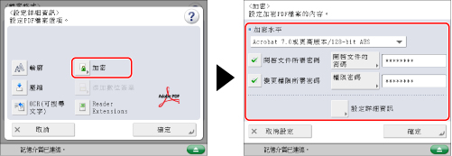 選擇此按鍵設定用於列印或編輯已掃描PDF的密碼。若選擇此按鍵,則可以指定如<允許列印>、<允許變更>和[啟用可存取性、影印和影像/文字擷取]的設定。