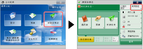 若要使用該功能,必須先在常用設定按鈕中註冊所需文件設定和接收者。有關在常用設定按鈕中註冊接收者和設定的說明,請參閱"註冊/編輯常用設定."