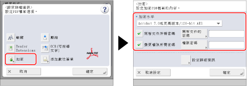 利用該模式,可以為傳送到電子郵件位址或檔案伺服器的PDF檔案加密,以增強安全性。