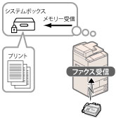 受信したファクス文書をプリントせずに、システムボックスに保存するように設定できます(メモリー受信)。システムボックスにメモリー受信された文書は、相手先やページ数などの詳細情報を確認したあと、好きなときにプリントしたり、別の宛先に再送信したりできます。