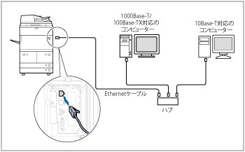 1000Base-T、100Base-TX、10Base-T対応の機器が混在しているときは、スイッチングハブなど、1000Base-T、100Base-TX、10Base-Tのすべてに対応した機器が必要です。詳しくは、お買い求めの販売店、または担当サービスへお問い合わせください。