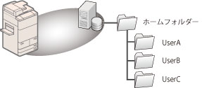 各ユーザーがマイフォルダーとして使用できるのは、管理者が指定するフォルダー(以降、ホームフォルダーと呼びます)配下にある、専用フォルダー(ファイルサーバーログイン時のユーザー名のフォルダー)に限定されます。