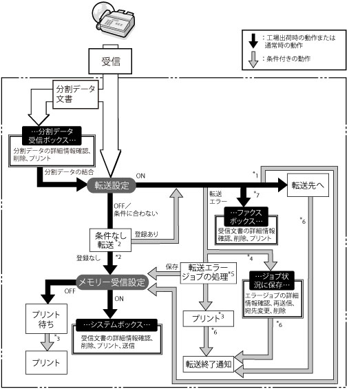 *1 [転送設定]で<受信ファイルの保存/プリント>を「ON」にすると、転送した文書はプリントされるか、システムボックスに保存されます。