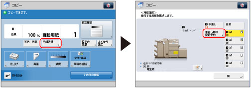 手差し用紙のデフォルト設定が登録されているときは、用紙のサイズ/種類をあらかじめ選択している画面が表示されます。(→手差し用紙のデフォルト設定を登録する)
