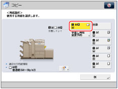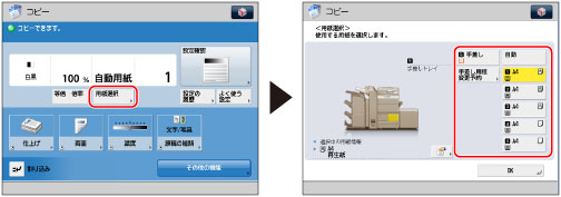 [用紙カセット自動選択のON/OFF]で「OFF」に設定した用紙カセットの用紙には自動用紙選択ではコピーできません。(→機能ごとに給紙箇所を自動で選択する)また「ON」に設定されているカセットでも、用紙種類によっては自動用紙選択されない場合があります。自動用紙選択されない用紙カセットをお使いになる場合は、手動で指定したあとコピーしてください。