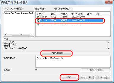 [特別]タブの[セキュリティ設定]を設定している場合、[宛先一覧に追加]をクリックすると宛先確認のダイアログボックスが表示されます。詳しくはヘルプを参照してください。(→「ヘルプを表示する」)