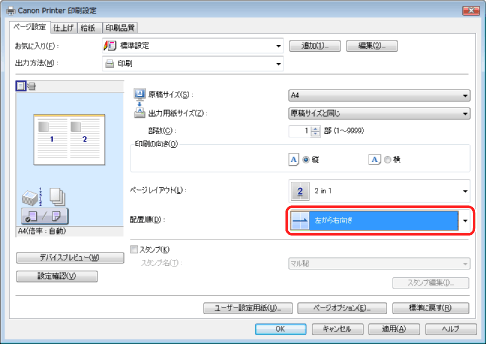 [ページレイアウト]で項目が選択できない場合は、[コントロールパネル]からプリンターのプロパティ画面を表示して[デバイスの設定]タブをクリックしたあと、[内部スプール処理]から[自動]または[必ずホスト側で処理を行う]を選択してください。プリンターのプロパティ画面の表示方法については、「プリンターのオプション設定をする」を参照してください。