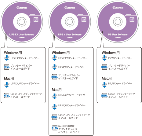 プリンタードライバーは、User Software CD-ROMに収録されています。複数のCD-ROMが付属している場合には、次の情報を参考に、CD-ROMおよびプリンタードライバーを選択してください。